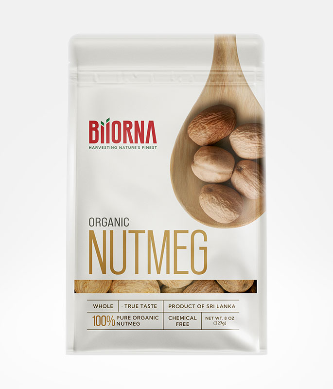 Our organic nutmeg boasts a greyish-brown to brown appearance and exudes a rich aroma. The flavor is complex, with a warm, sweet undertone and a hint of bitterness. Nutmeg is a versatile spice used in both savory and sweet applications. In European cuisine, it pairs beautifully with potatoes and beef, while in Indian and Japanese curries, it adds a unique depth of flavor.